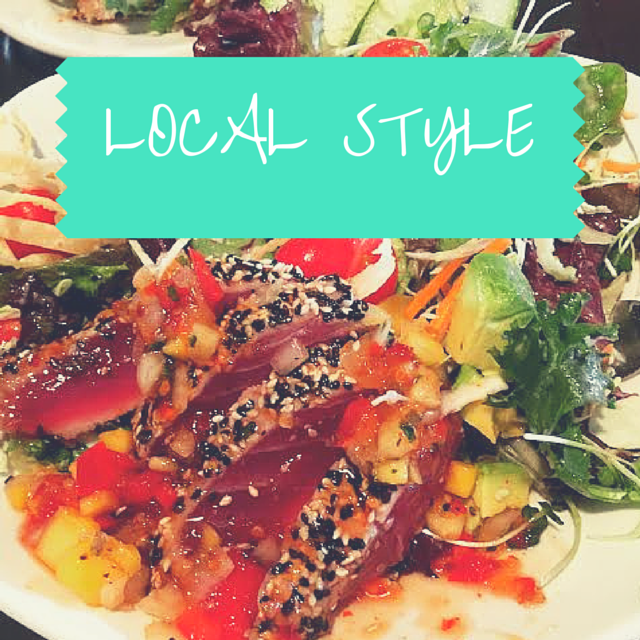 Local style is a term for anything locals like to do. That’s no exception to food. Local style food can be pretty much anything the locals like to eat, from ahi salad with mango salsa (pictured above), to spam musubi (spam on top of rice wrapped in nori), hot dogs, saimin (noodle soup) fried chicken, li hing mui (Chinese salted dry plum) candy, mochi, and shave ice. When in Rome!